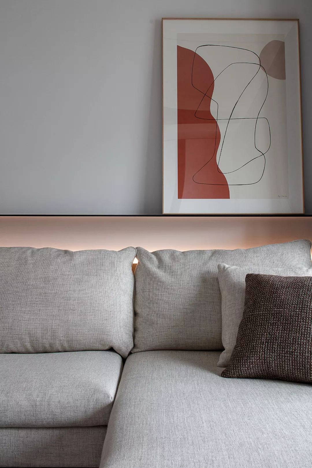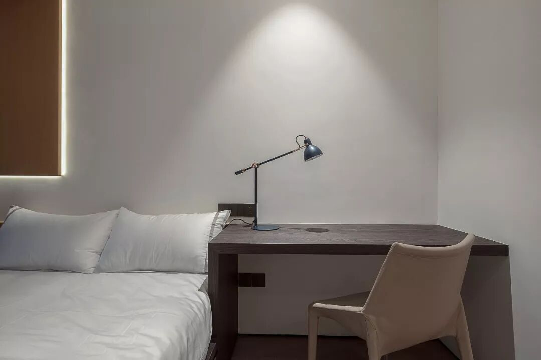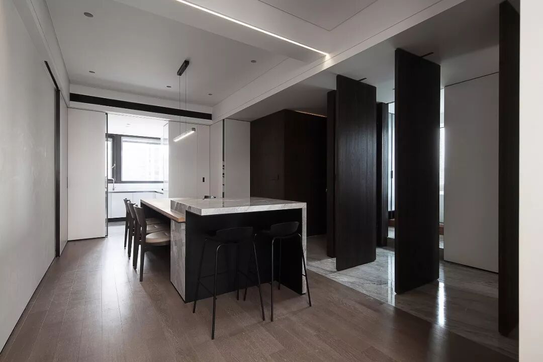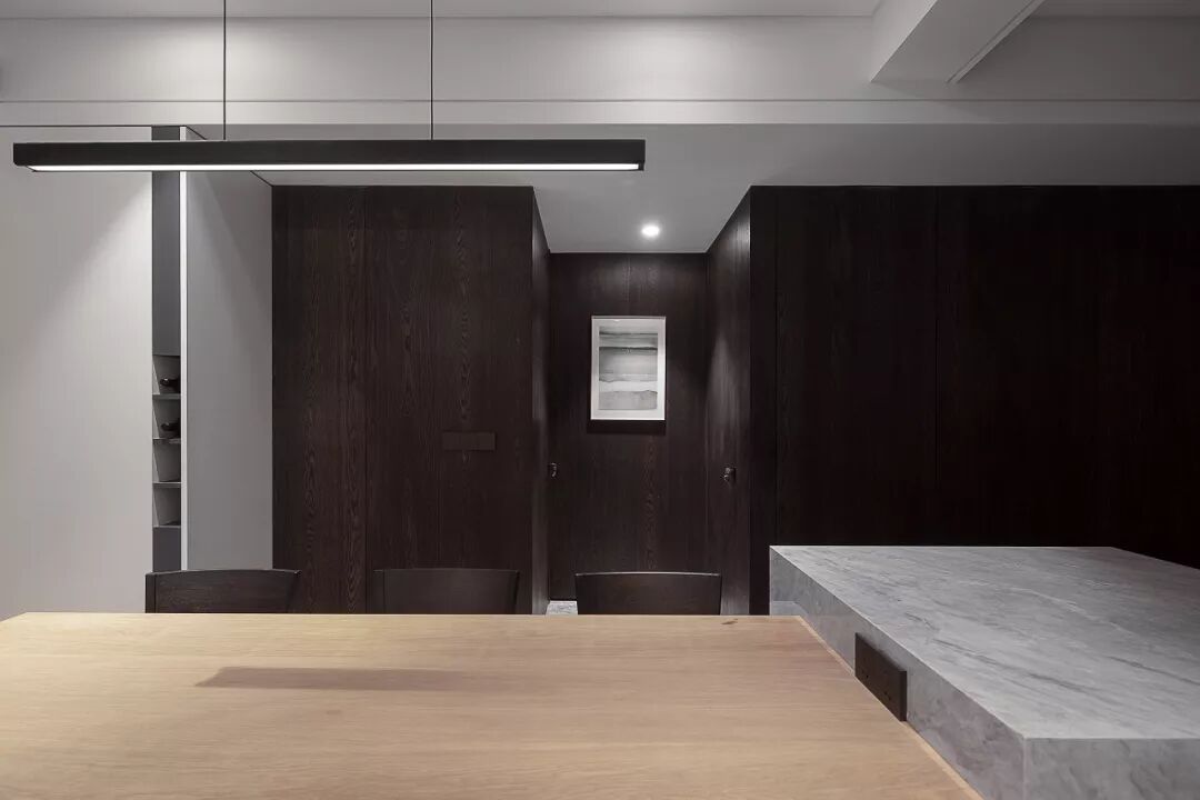 餐桌与岛台的结合可兼做休闲吧台、工作区、西厨区,极简元素吊灯陪衬,桌面的长度延伸量体在空间中的视觉感受尺度。