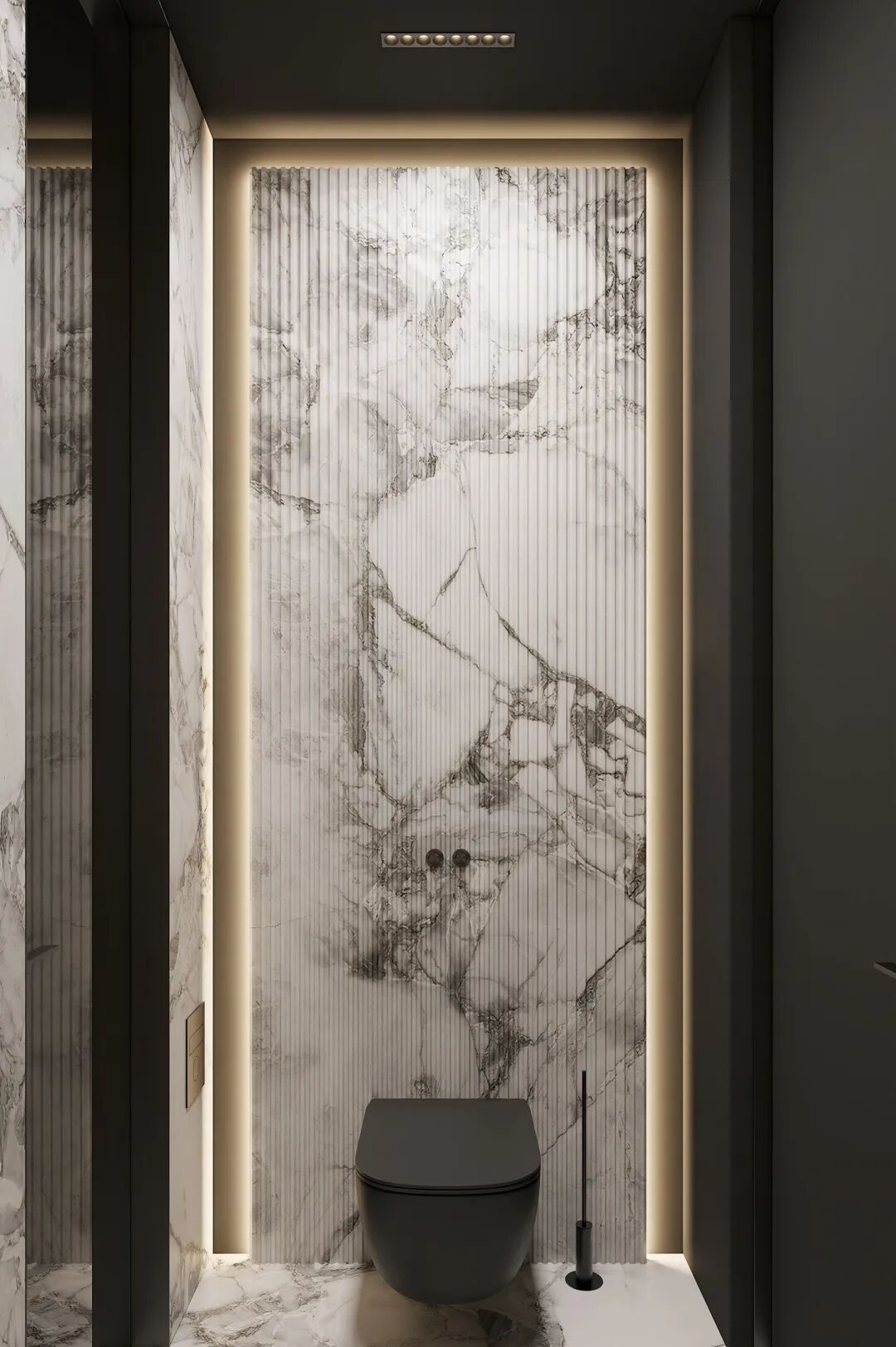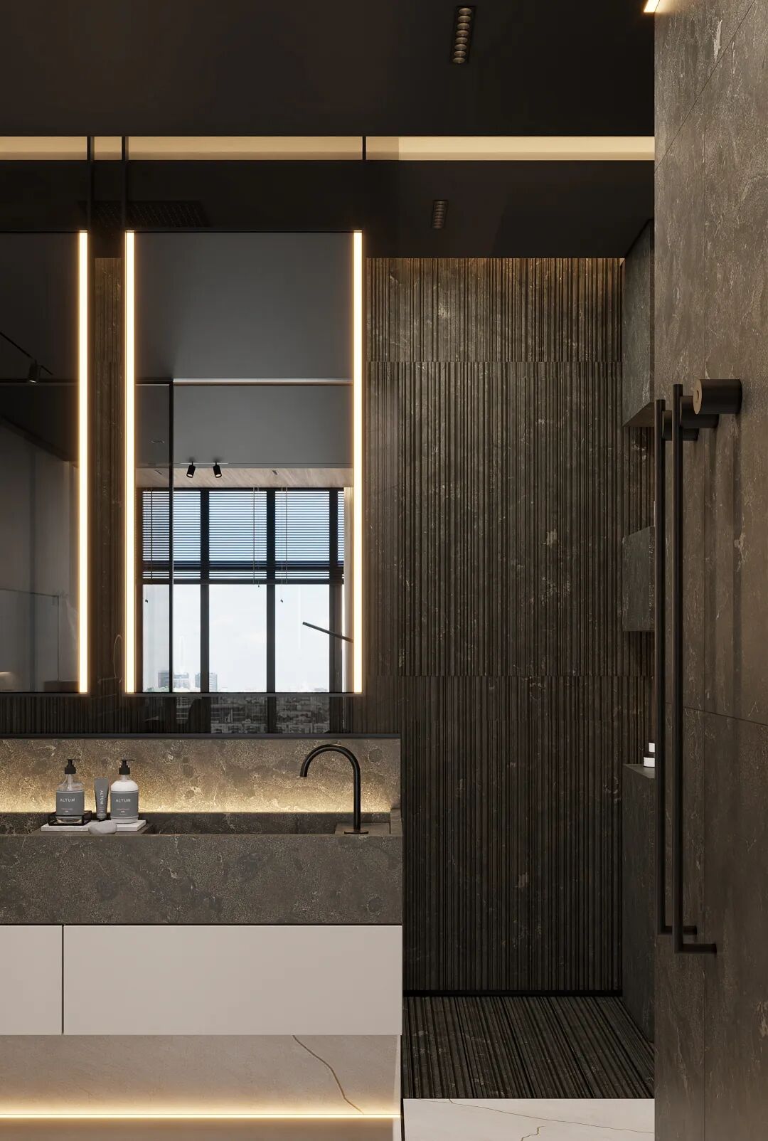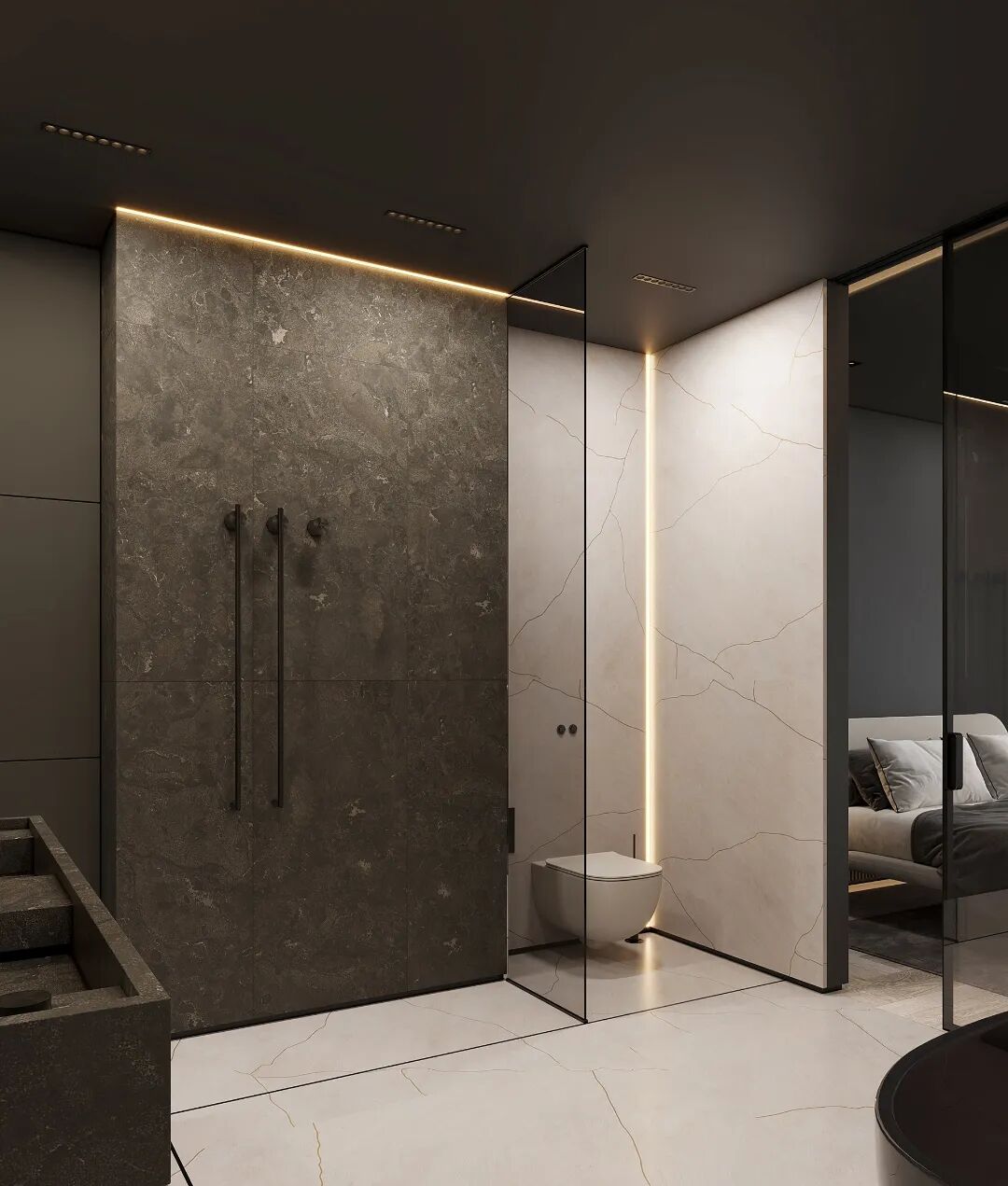 卫浴间的设计,简洁的线条勾勒下填充原生态的纹理,在灯光的配合下,没有辞藻华丽的内饰,纯净柔和的氛围舒适放松。