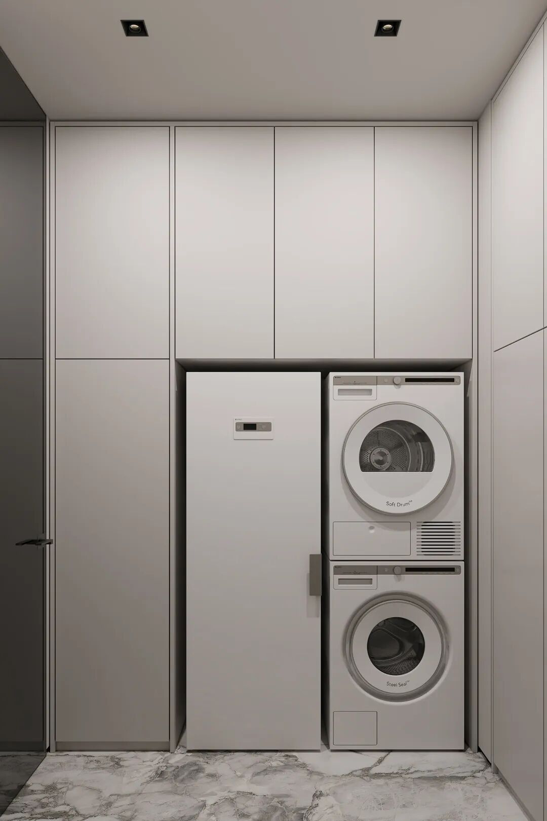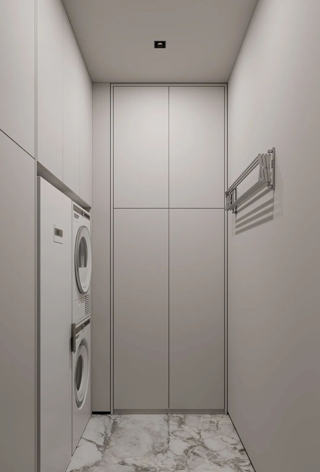 灰色调的洗衣房,充分利用每一个角落,并将洗衣机嵌入柜内,简易收纳柜,让这个小空间也能发挥不小的作用。这样设计不仅合理,而且还非常的实用好看。