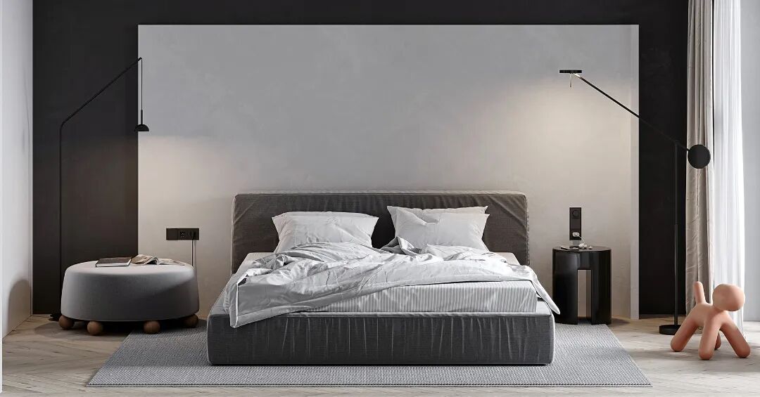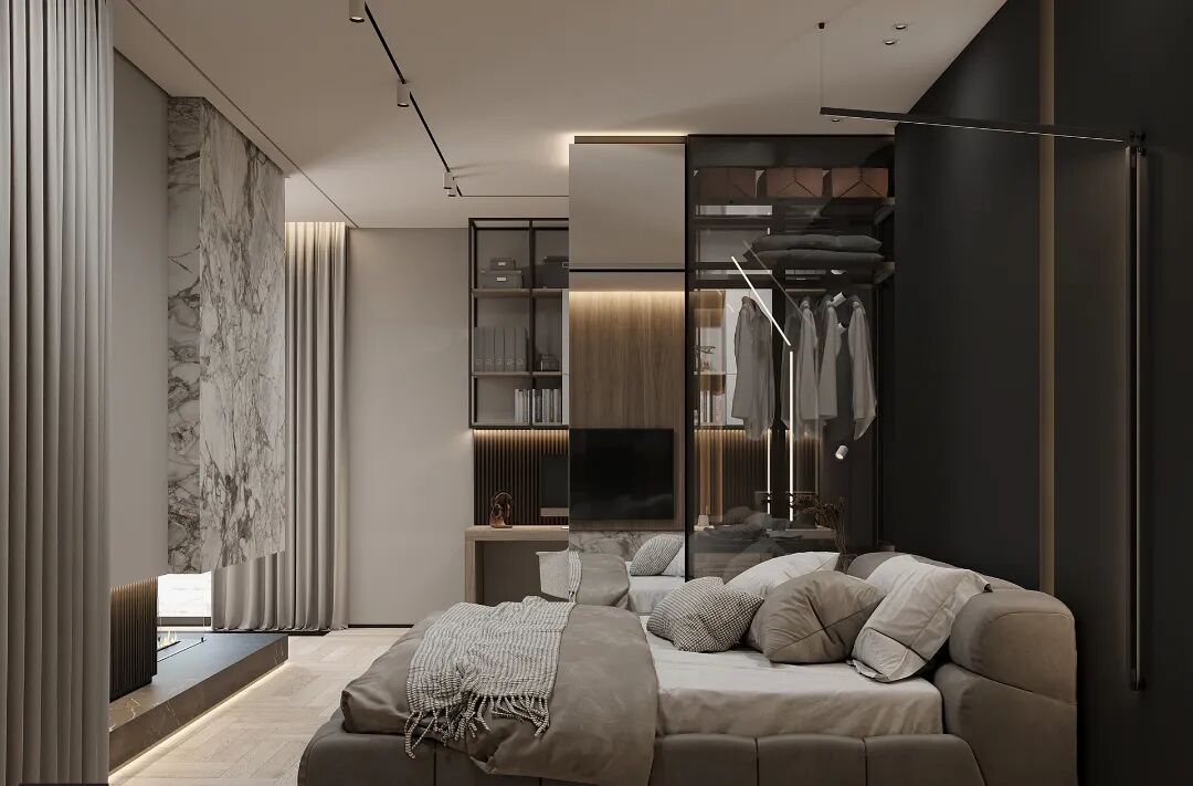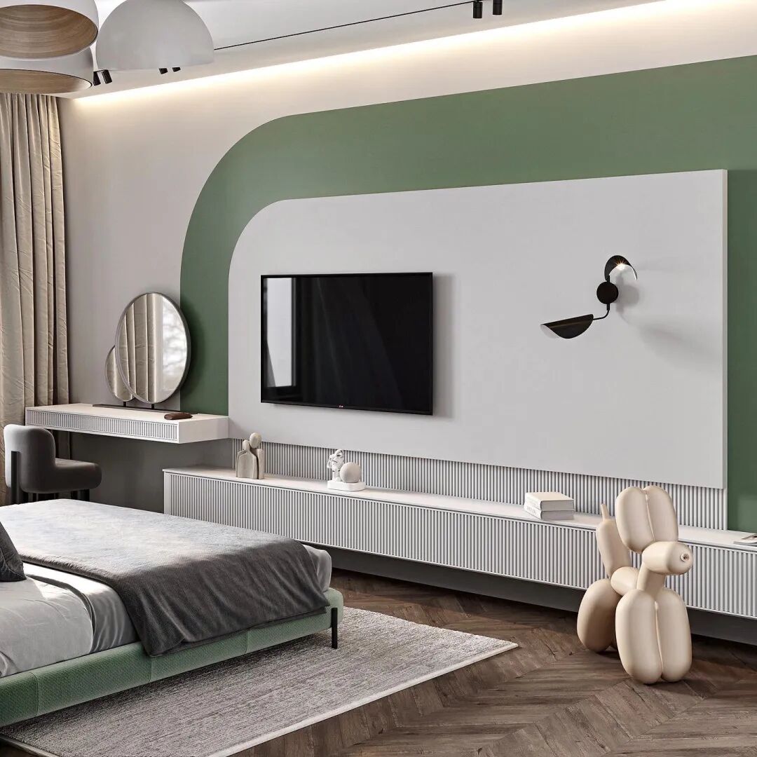 卧室同样采用了简约而富有质感的设计,床头背景以深色调为主,配以浅灰色的床品,营造出了舒适宁静的氛围。旁边的木饰面电视背景,极具设计气质。