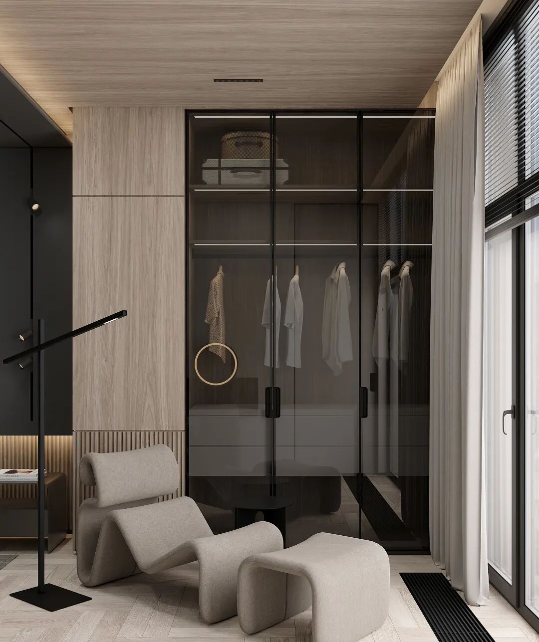 主卧沿用了客厅的色彩,高级黑的背景墙有着石墨般的厚重感,不动声色中透露出低调的优雅,搭配木饰面,简洁温润且富有高级感,空间透露出轻松舒适和惬意的气息。