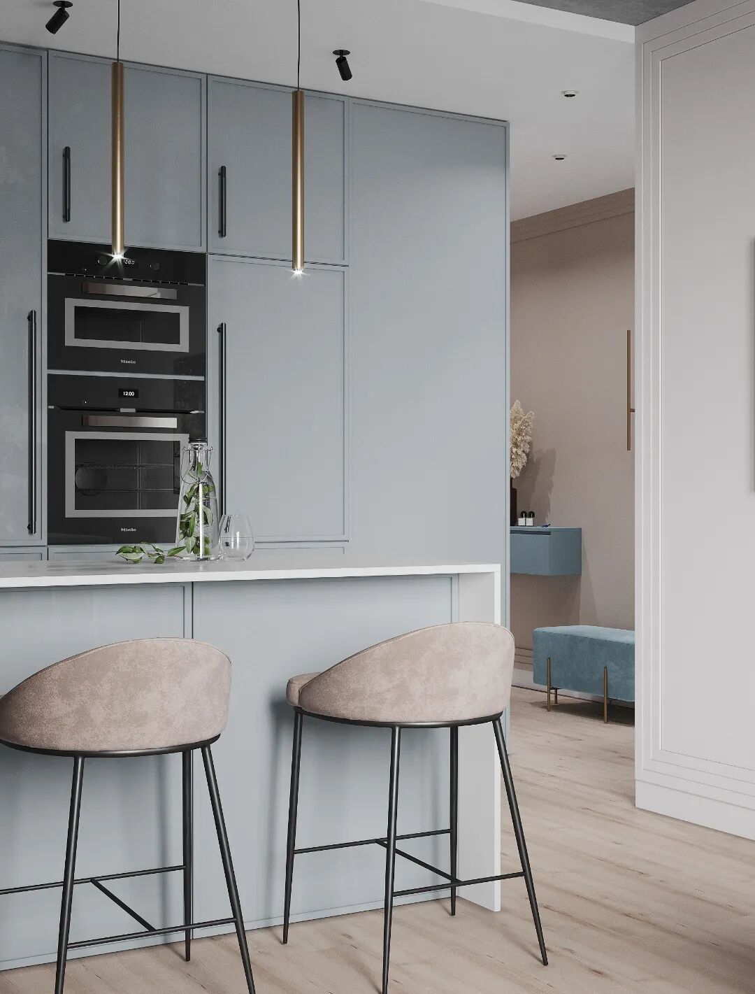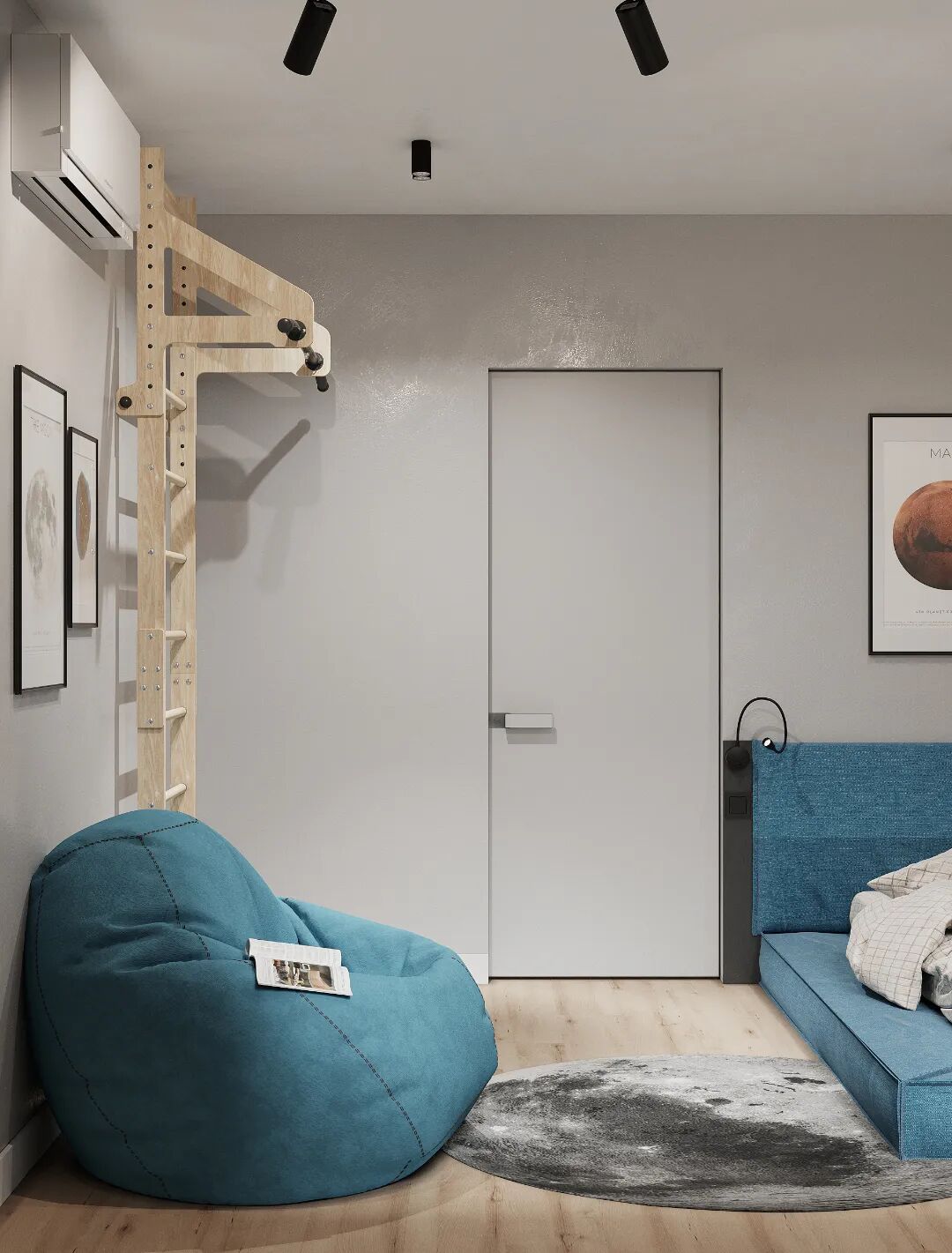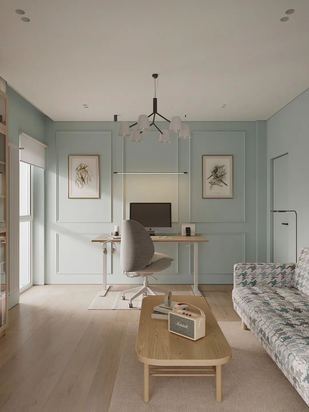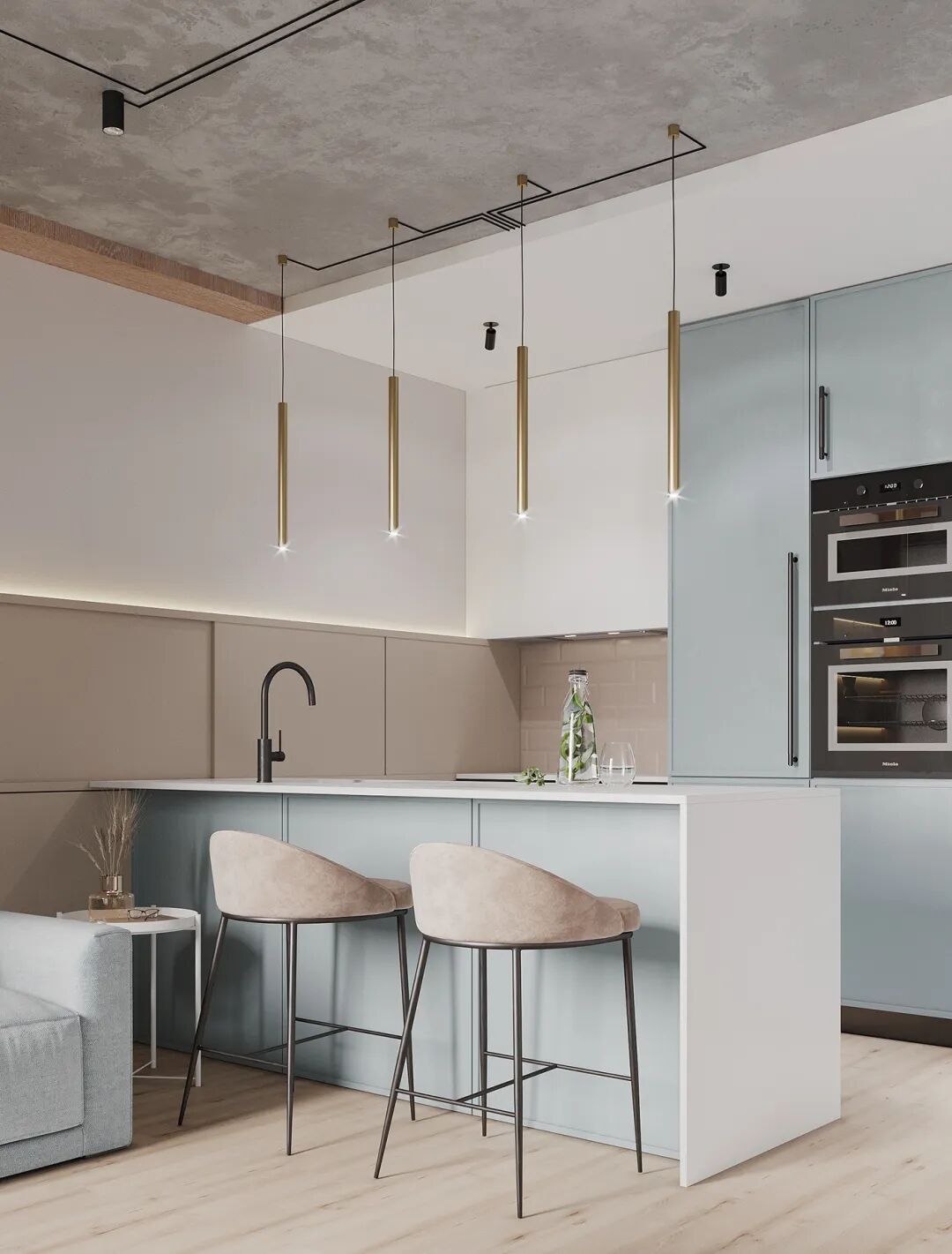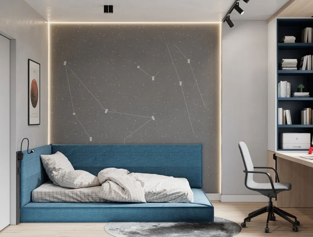 客厅也是低饱和度的色调,蓝灰色布艺沙发呼应了整体色调,起到了视觉统一。不同材质的应用,丰富了空间层次感。
