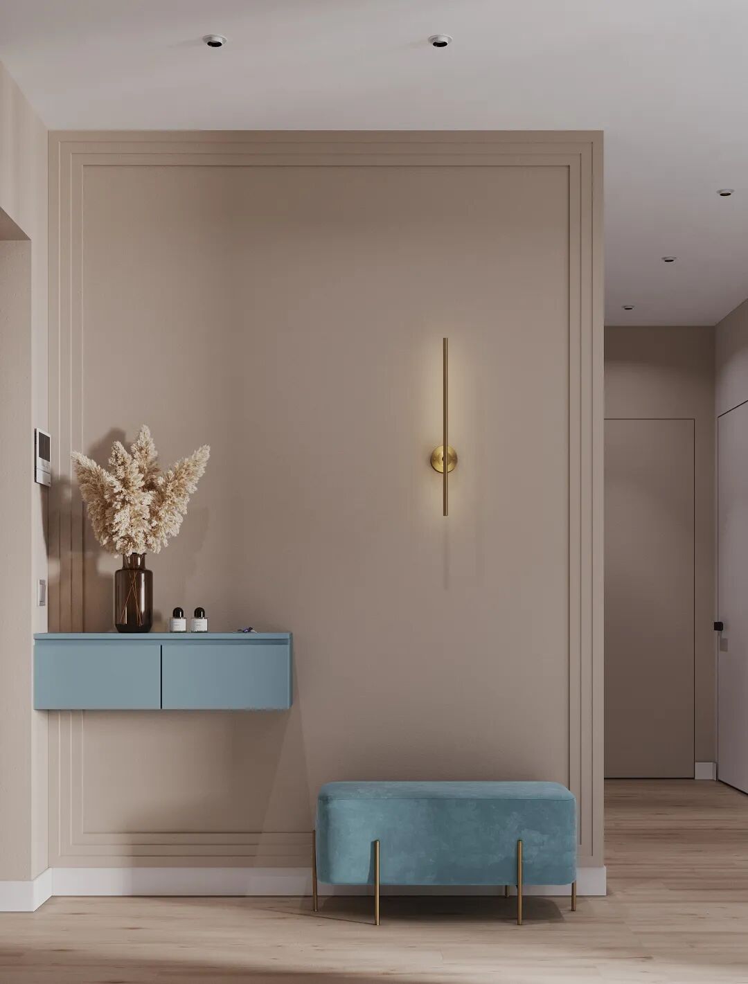 门厅的设计,以简单到极致为追求,由于空间大,左边是一排收纳柜,放置一张灰色的换鞋凳点缀,更显得雅致、时尚。