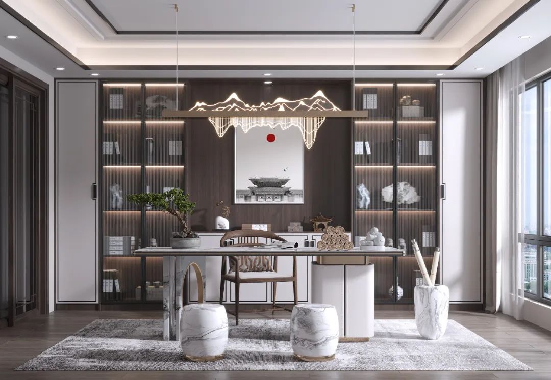 书房定制整墙书柜,同样采用了“对称式”设计,让书柜既兼具了中式美感,又展示与收纳兼备。超高门板“一门到顶”,线条流畅,简洁大方,延长了空间视野。